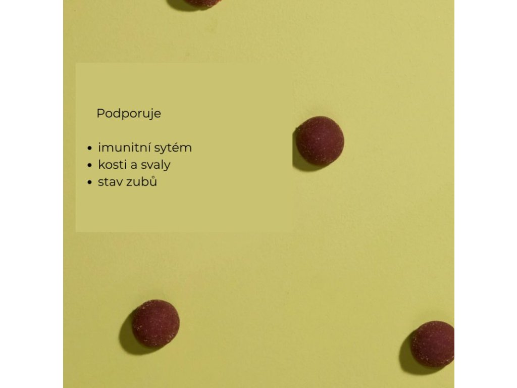 Bonbóny z celého ovoce pro dospělé, které obsahují doporučenou denní dávku (1000 IU) vitamínu D3. Každé balení vitamínových bonbonů obsahuje 13 celých plodů, které poskytují účinnou podporu kostí, svalů, zubů a pro silnou imunitu.