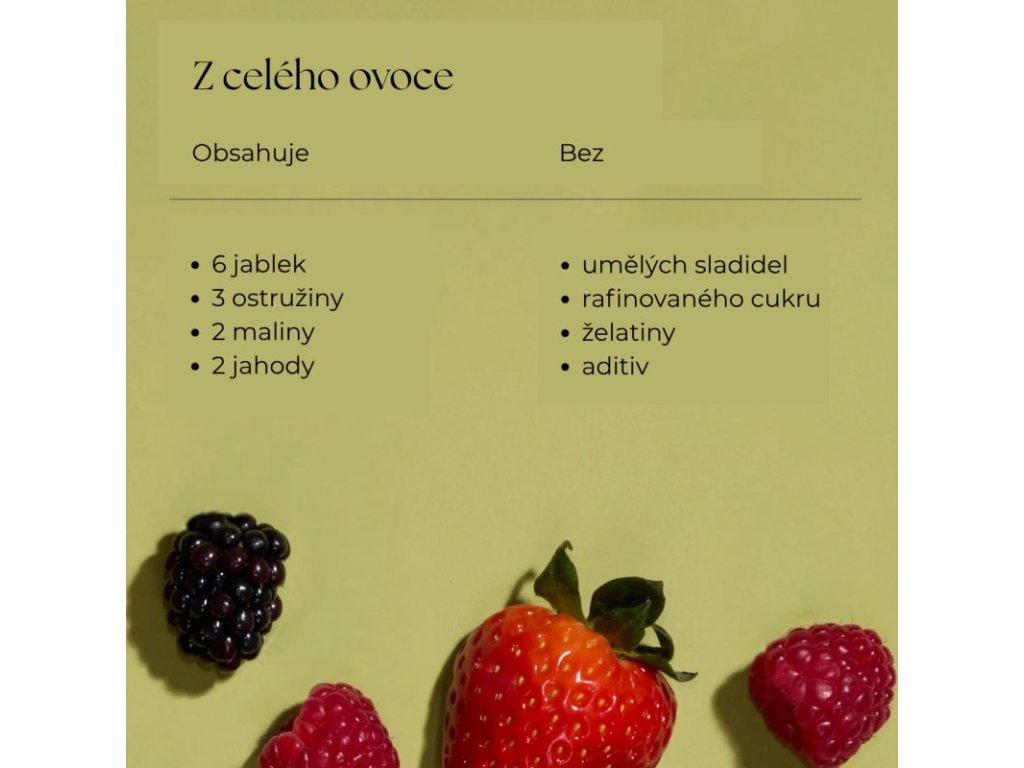 Složení: 96 % ovoce (57,5 % jablečný koncentrát, 22,5 % jablečné pyré, 8 % jahodové pyré, 5 % ostružinové pyré a 3 % malinové pyré), želírující látka: pektin; koncentrát z černé mrkve, koncentrát z citronové šťávy; citrusová vláknina*, přírodní aroma a vitamin D3 (kapsle s cholekalciferolem).