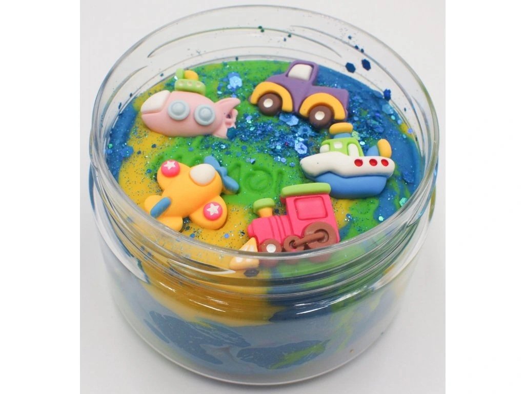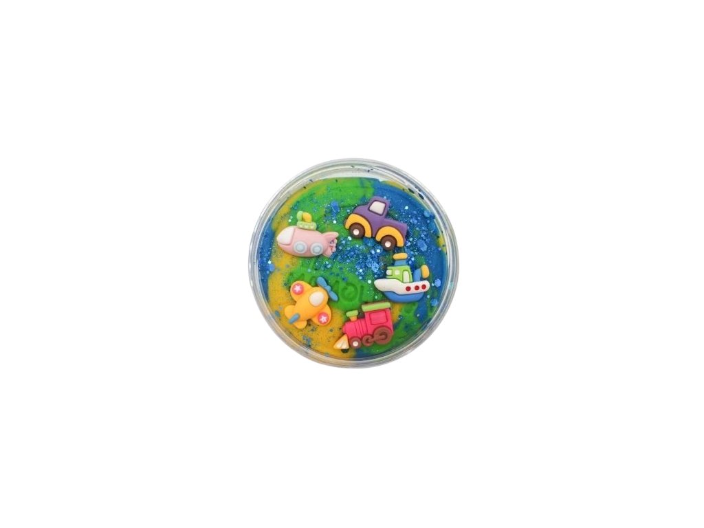 Voňavá a měkkoučká tříbarevná domácí modelína s třpytkami a 5 ks dekorací dopravních prostředků.