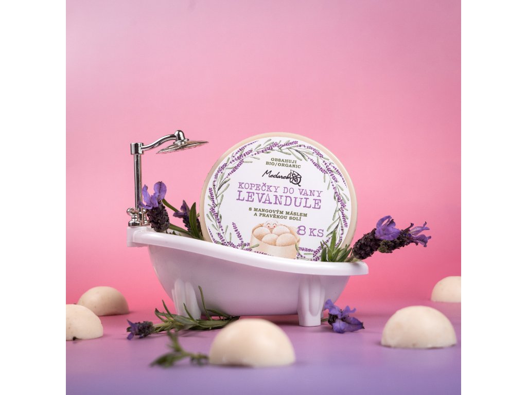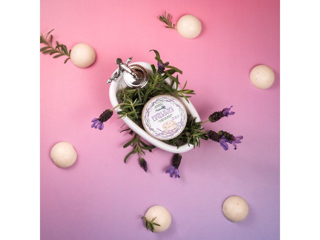 Pečující kopečky do vany s levandulovým esenciálním olejem a pravěkou solí.