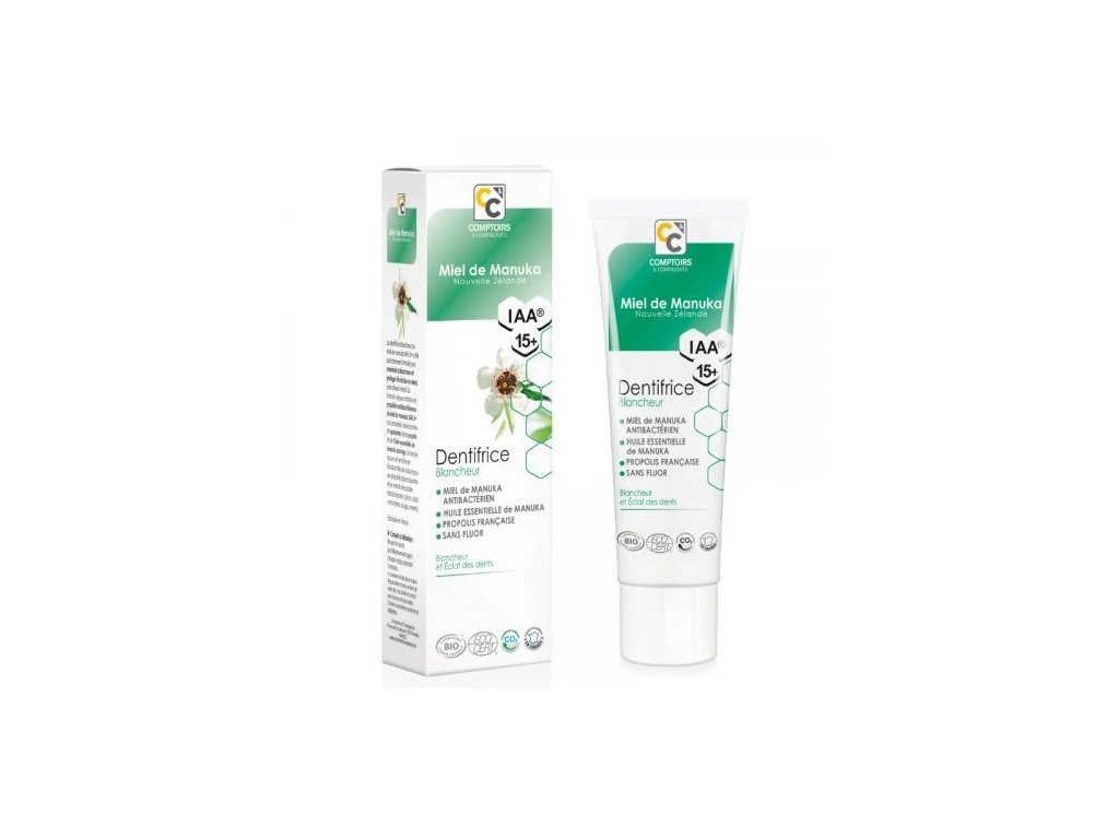 Svěží přírodní bělící zubní pasta s aktivním manukovým medem, propolisem, manukovým olejem, tea tree, bělícími složkami a čerstvými bylinnými extrakty.