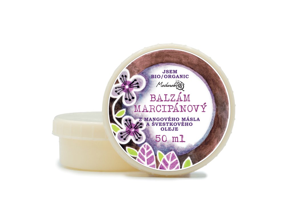 Zcela přírodní organický jemný balzám s vůní marcipánu vhodný pro promazávání suché i normální kůže. Základ tvoří bio mangové máslo, které je pro svou jemnost a dobrou snášenlivost vhodné pro nejmenší děti i osoby s citlivou kůží. Mangové máslo zvyšuje pružnost kůže a není tak mastné jako bambucké nebo kakaové máslo. Balzámek dále tvoří bio švestkový za studena lisovaný olej, který mu dodává příjemnou vůni. Olej patří mezi lehčí a nepříliš mastné oleje. Bio mandlový olej přináší kůži další benefity v podobě přírodního vitamínu E i zvýšení elasticity kůže.