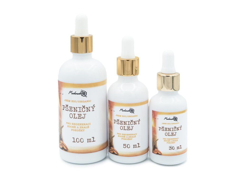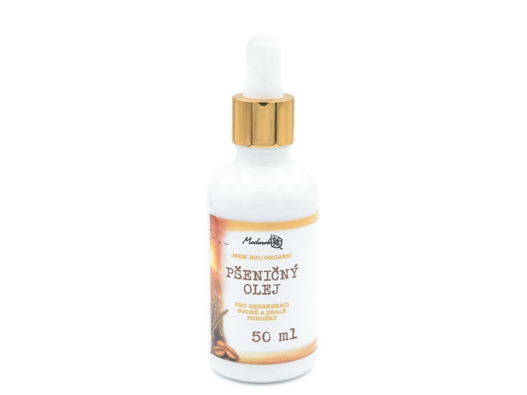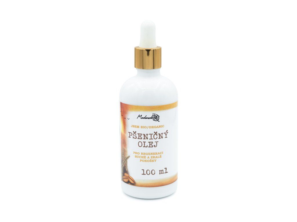 Bio pšeničný olej je získáván metodou lisování za studena z klíčků pšenice; jeho kosmetické využití je známé po staletí. Olej je bohatý na vitamíny a další výživné látky, které jsou prospěšné pro naši pokožku i vlasy. Mezi hlavní složky tohoto oleje patří vitamín E působící jako silný antioxidant. Pomáhá chránit pokožku před poškozením volnými radikály a podporuje regeneraci pokožky, což může přispět k její pružnosti a mladistvému vzhledu. Dále zde najdeme vitamíny skupiny B, které jsou pro zdraví pokožky velmi důležité a mastné kyseliny omega-6 a omega-9, které pomáhají udržovat hydrataci pokožky a podporují její bariérovou funkci. Olej může být nápomocen v péči o kůži s ekzémem a jinými kožními problémy. Přikládání olejových obkladů zvláčňuje a změkčuje ztvrdlou kůži na loktech nebo na chodidlech. Olej je vhodný i pro děti od narození.