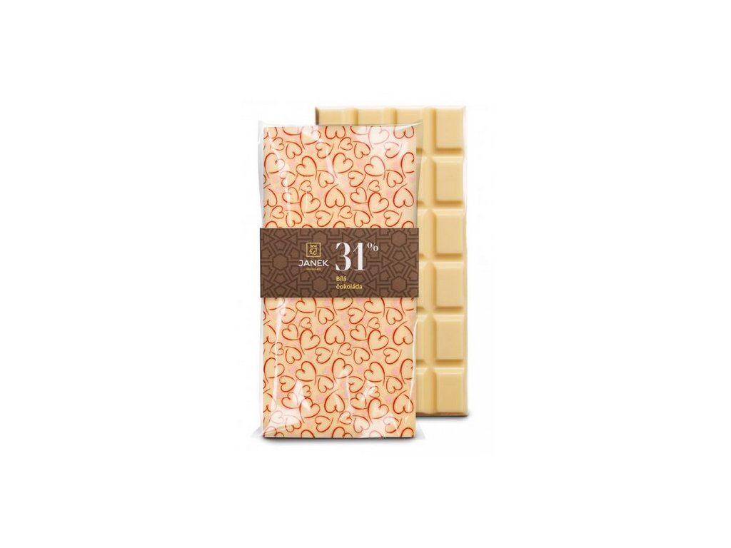 Bílá vanilková čokoládka od Janka se srdíčkovým potiskem.