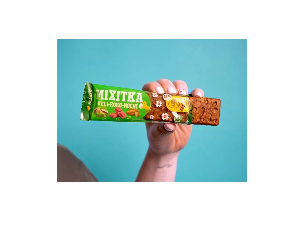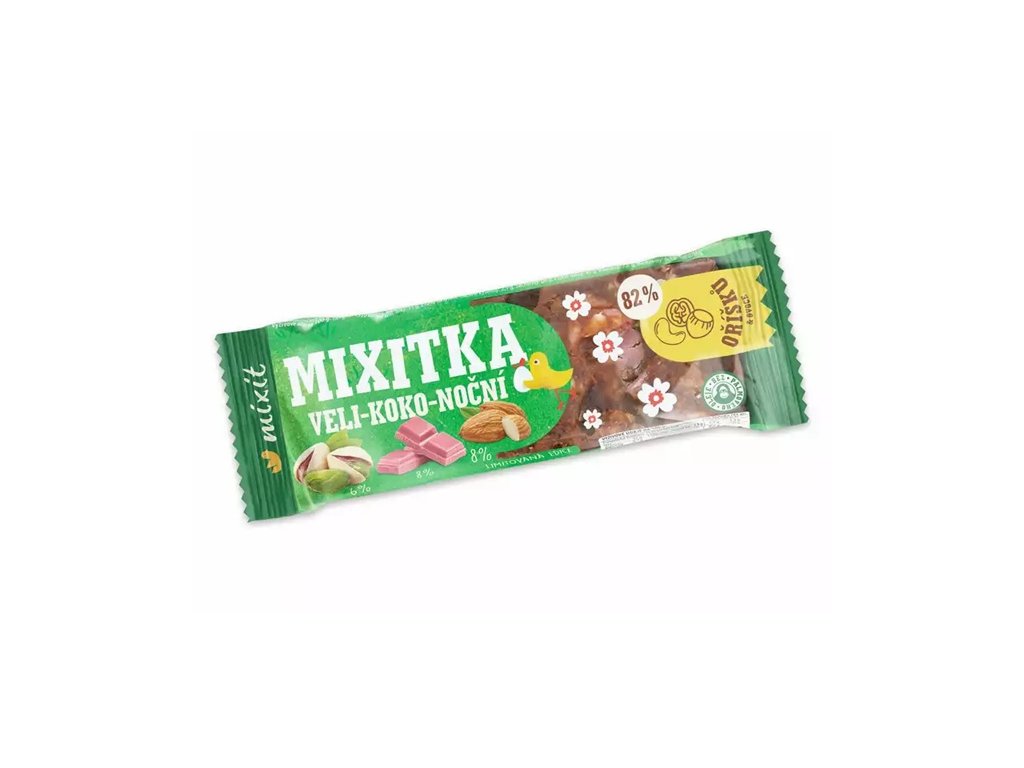 Limitovaná velikonoční edice mixitky s voňavými dobrotami - datlemi, brusinkami, pistáciemi a mandličkami, čokoládovými křupinkami a růžovou RUBY čokoládou. Obsahuje 76 % ořechů a ovoce, má vysoký obsah vlákniny, je bez palmového oleje.