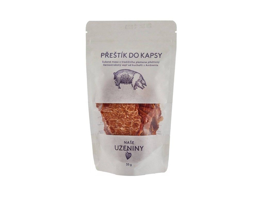 Přeštík do kapsy je sušené vepřové maso vyrobené z tradičního plemene černostrakatého vepře.