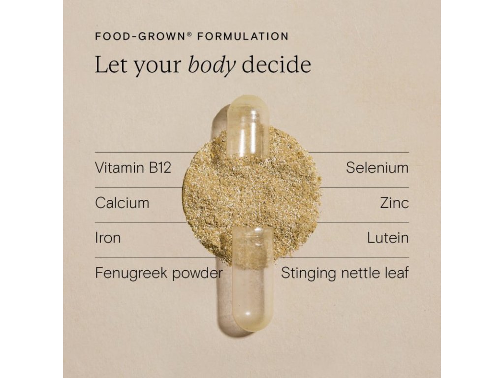 Složení: Lithothamnium Calcareum (červená řasa) prášek - dodává vápník, pískavice řecké seno prášek, kvasnice obohacené o živiny - dodávají železo, zinek, selen a vitamin B12, rostlinná celulóza (obal kapsle), extrakt z listů kopřivy dvoudomé a měsíčku lékařského - dodává lutein.
