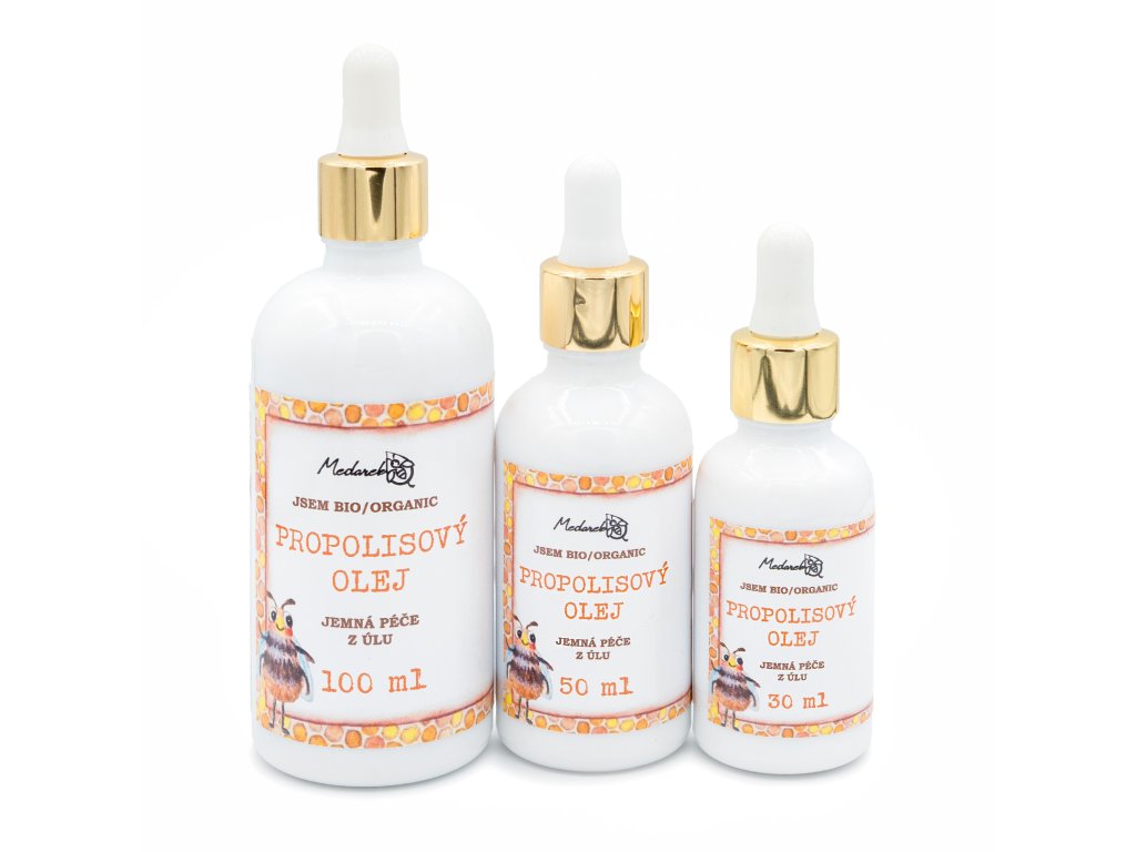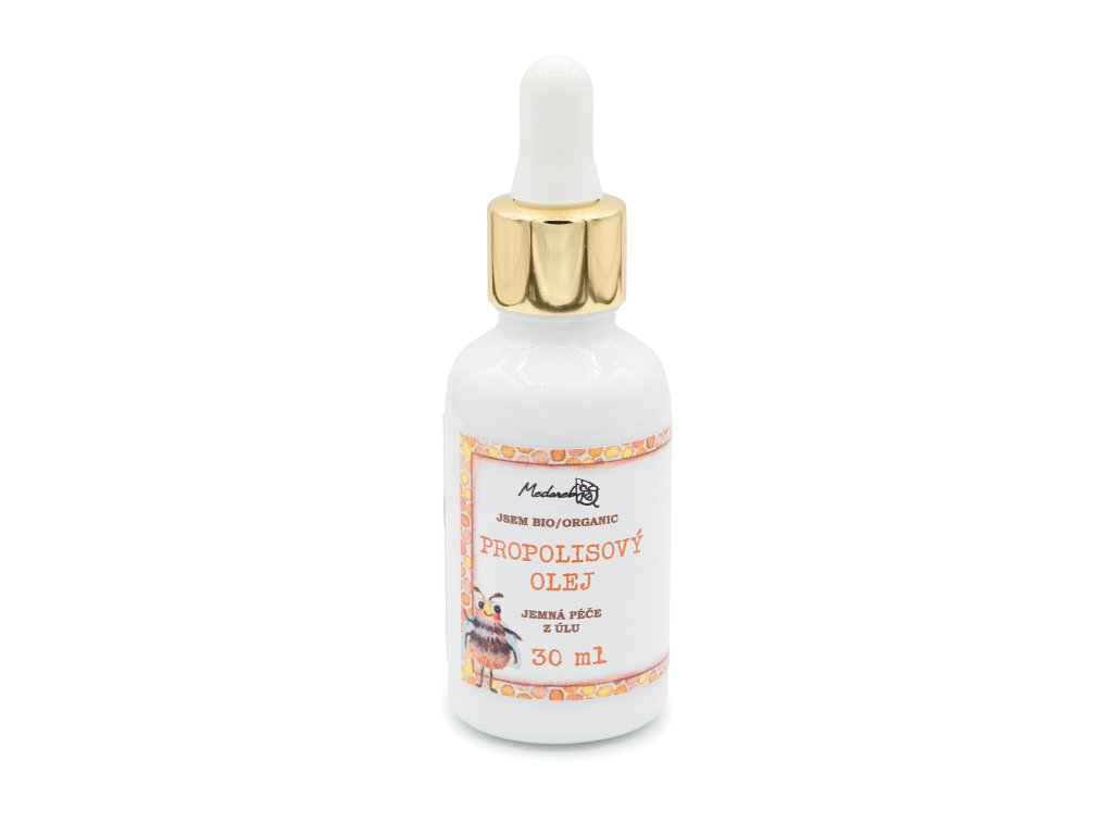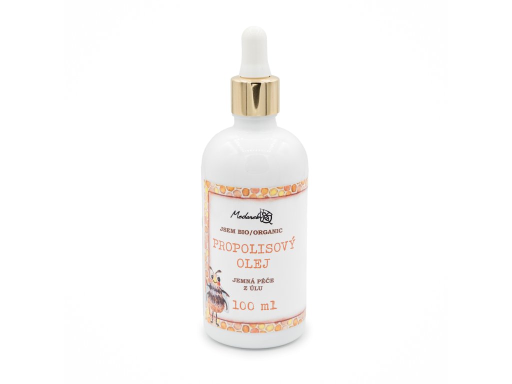 Zcela přírodní a 100% bio (organický) propolisový olej vznikl macerací bio propolisu v bio mandlovém oleji. Olej je jemnou verzí alkoholových tinktur. Použít jej můžete již pro děti od jednoho roku.